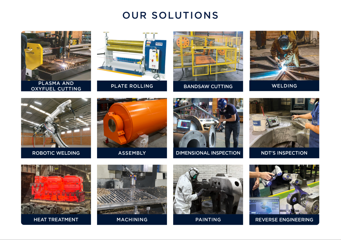 Among the manufacturing processes are: Plasma and oxyfuel cutting; Plate rolling; Bandsaw cutting; Welding; Robotic welding; Assembly; Dimensional inspection; NDT's inspection; Heat treatment; Machining; Painting; and, Reverse engineering.